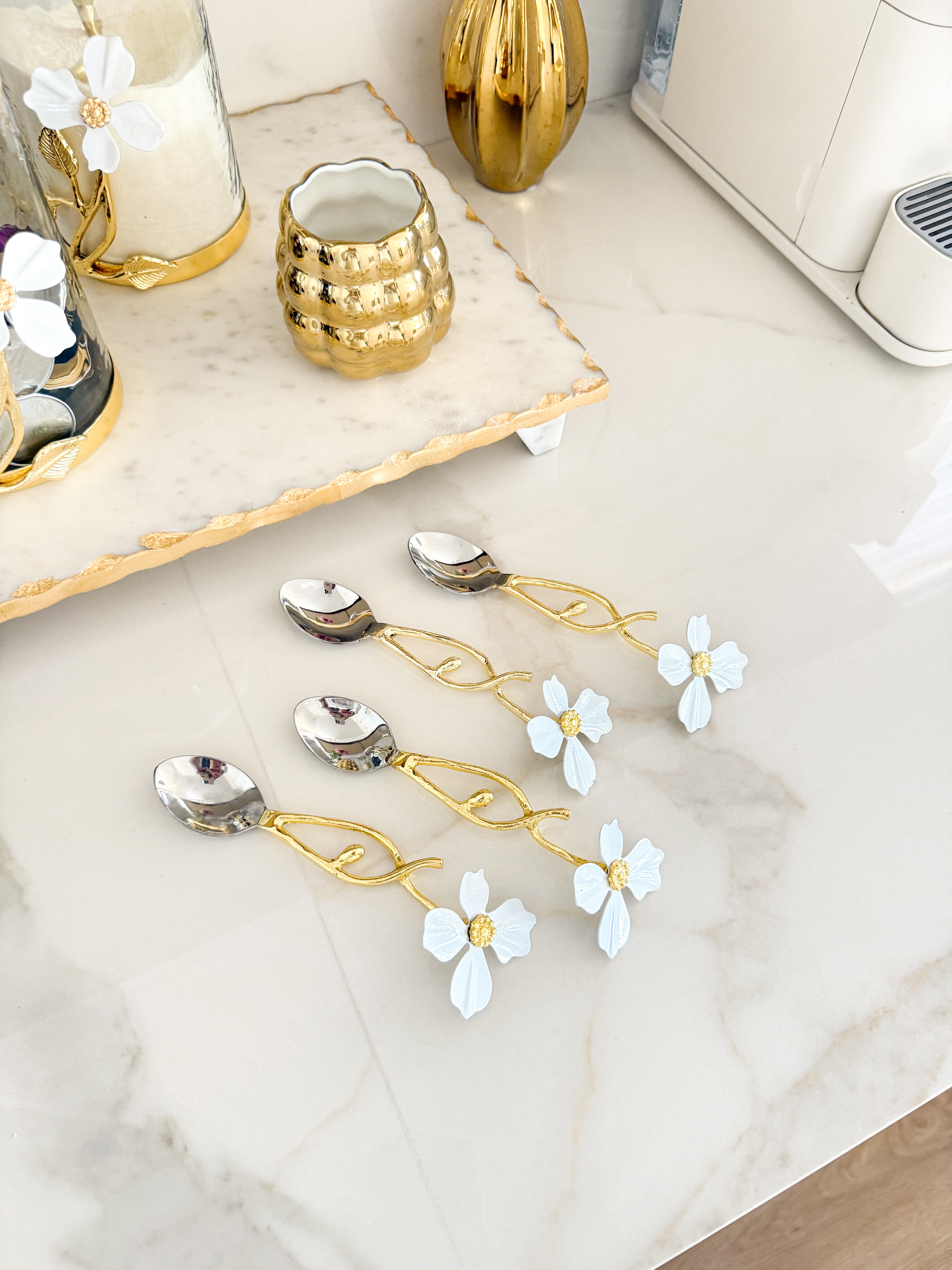 Gold Tea Spoon with White Jasmine Flower Design (Set of 4)