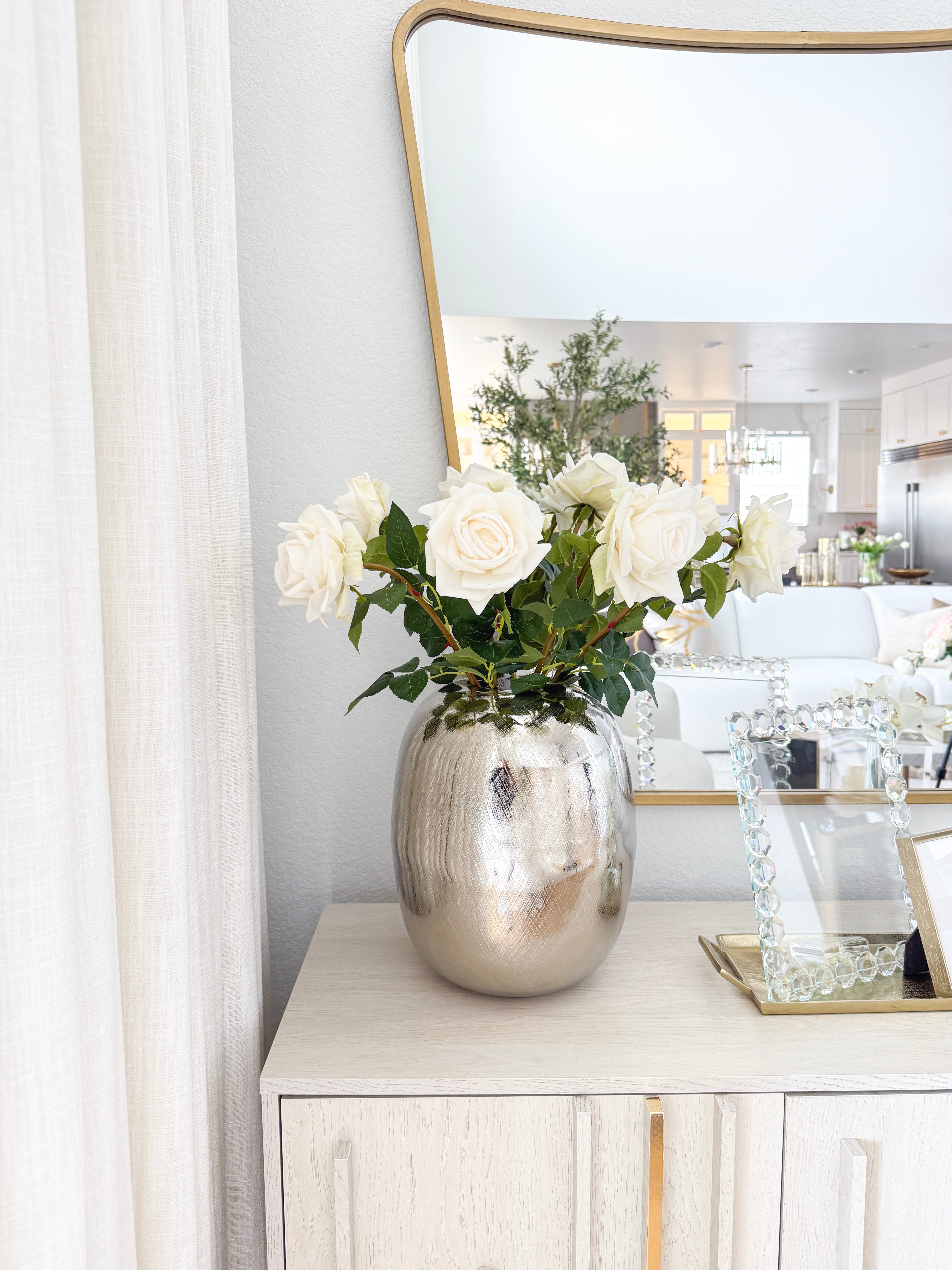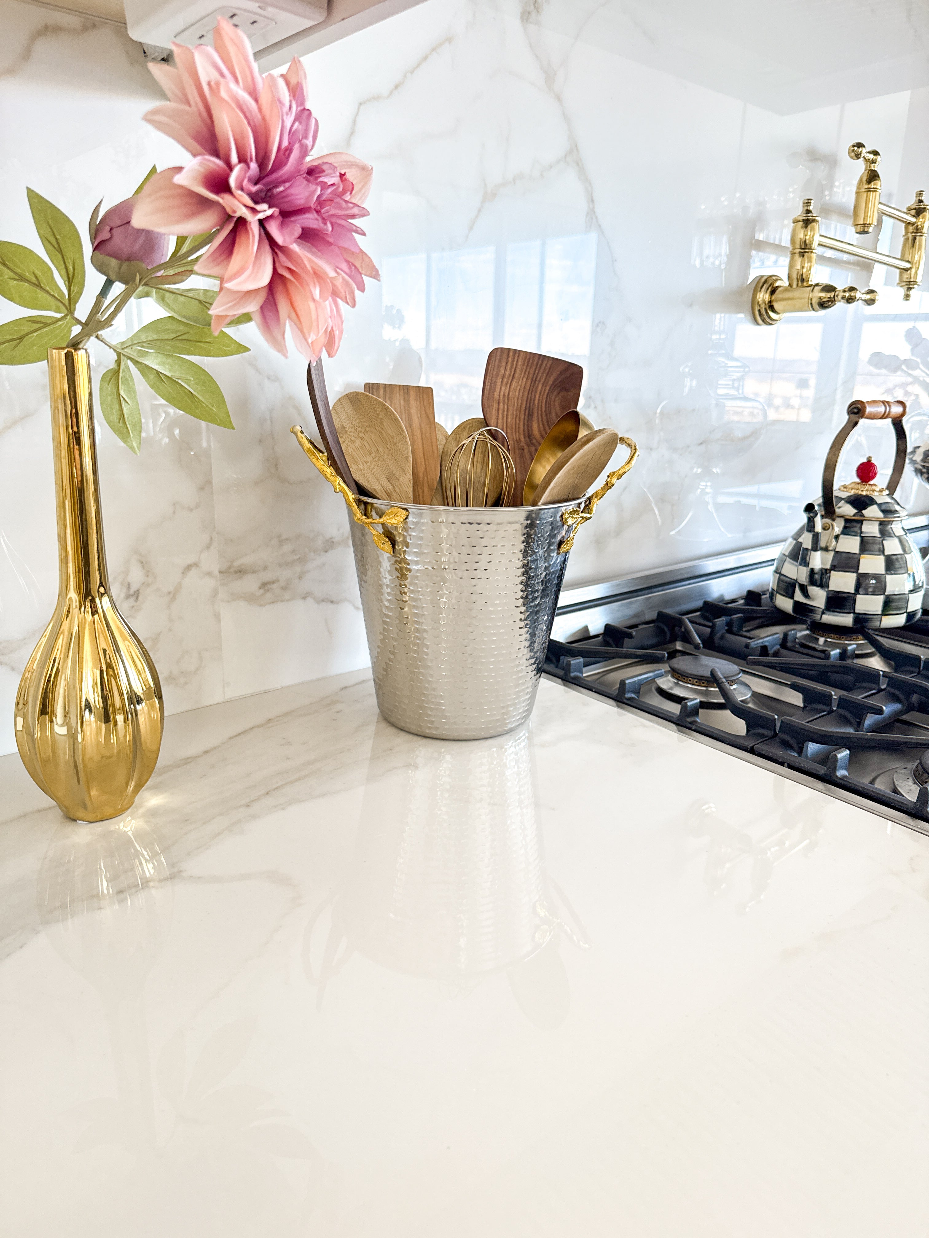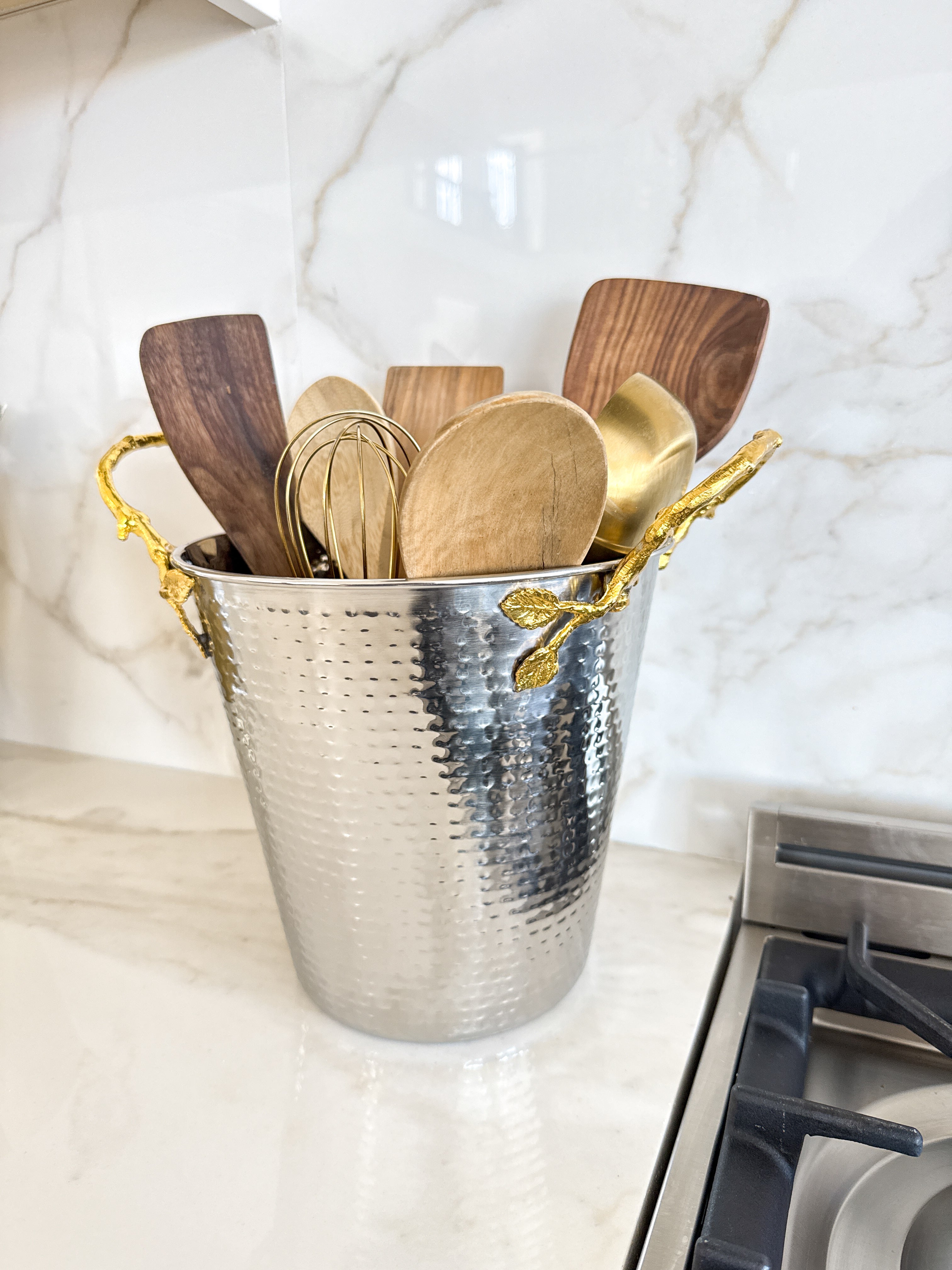 Silver Hammered Kitchen Utensil Holder with Gold Leaf Handles